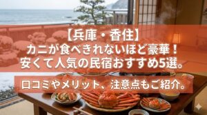 いずれもカニ食べ放題付きの宿が多く、通年で提供しているのがうれしいポイントです。